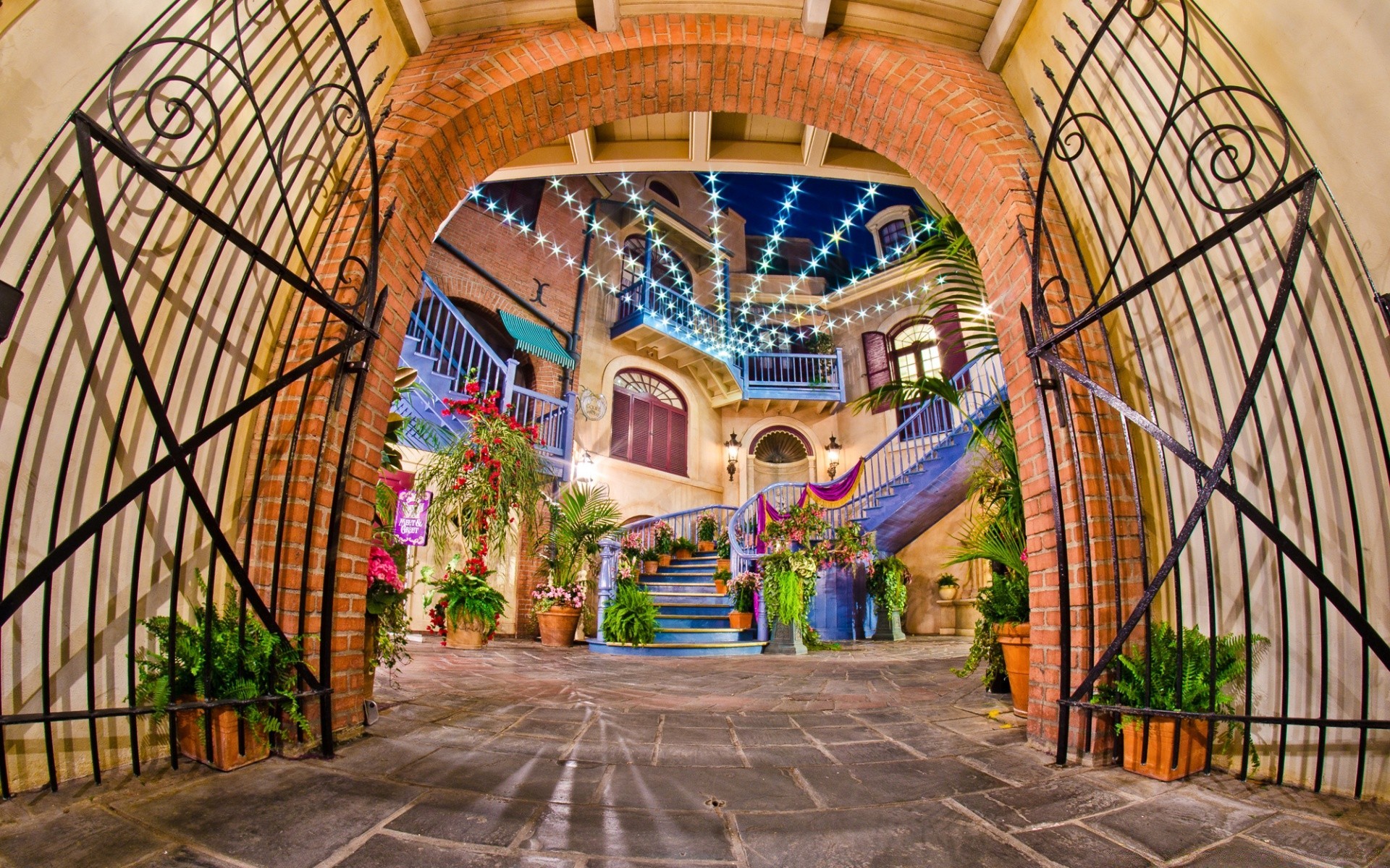 Une cour confortable et lumineuse derrière les portes ouvertes