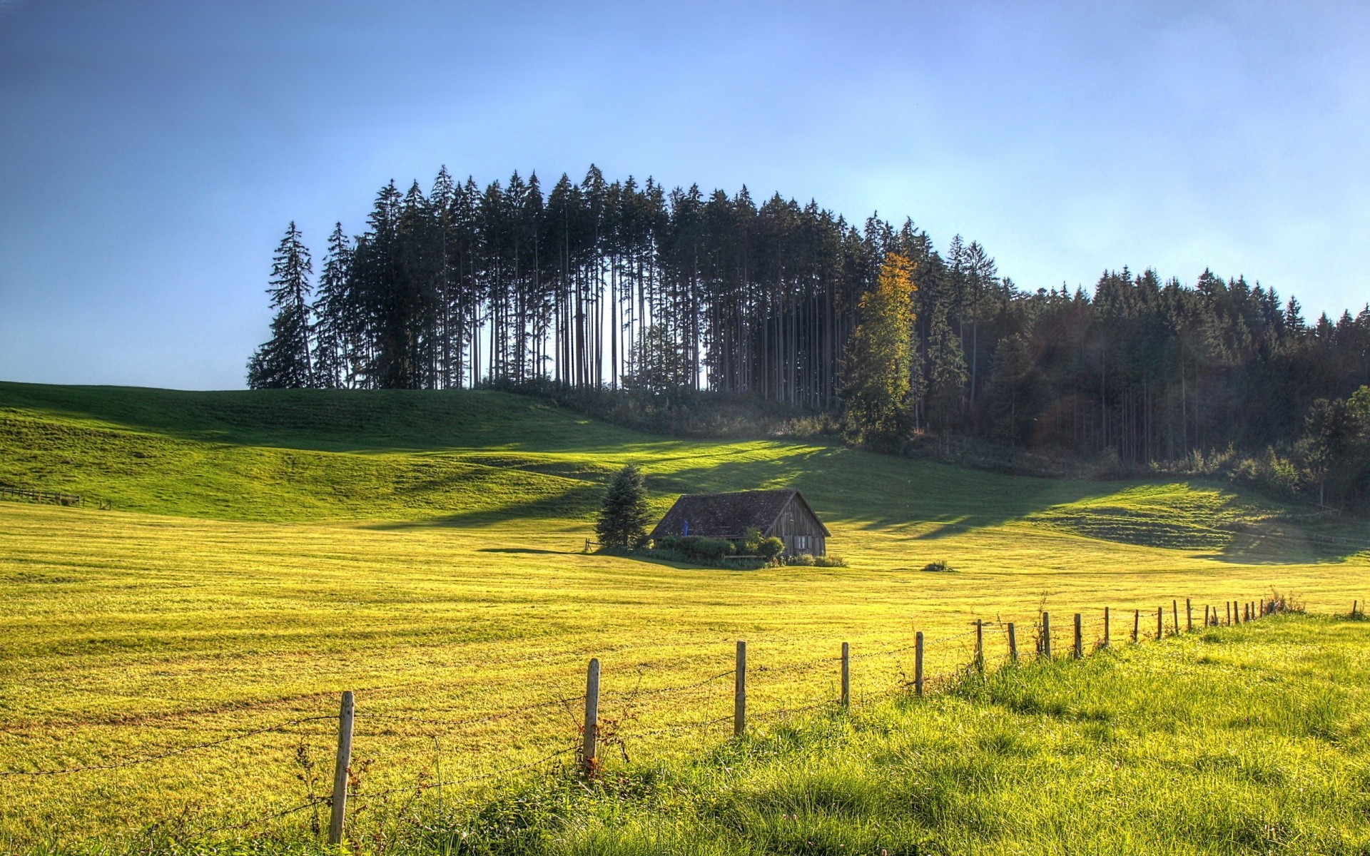 Paysage de la nature. Champ, montagnes, forêt et ciel