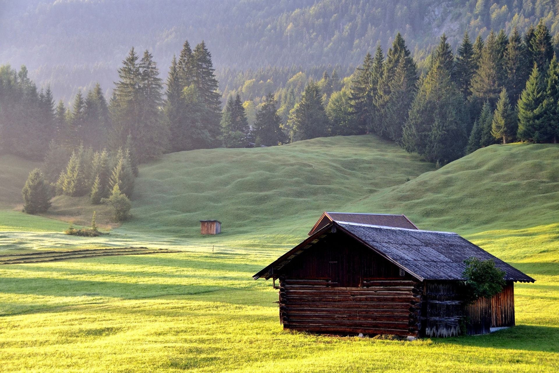 Paysage de montagne verte avec des sapins ciel bleu soleil lumineux avec des nuagesPaysage de montagne verte avec des sapins ciel bleu soleil lumineux avec des nuages