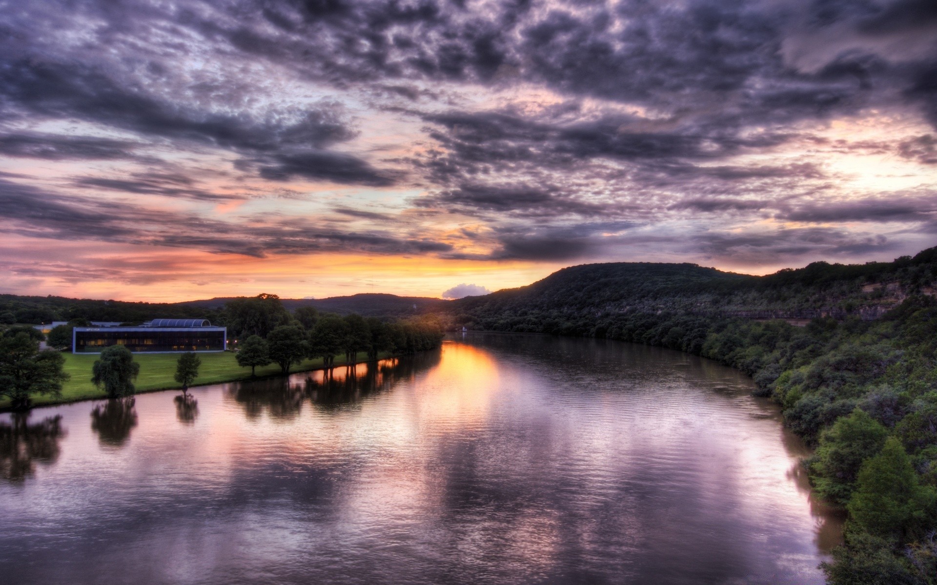 Paysage avec coucher de soleil et plan d'eau dans la nuit