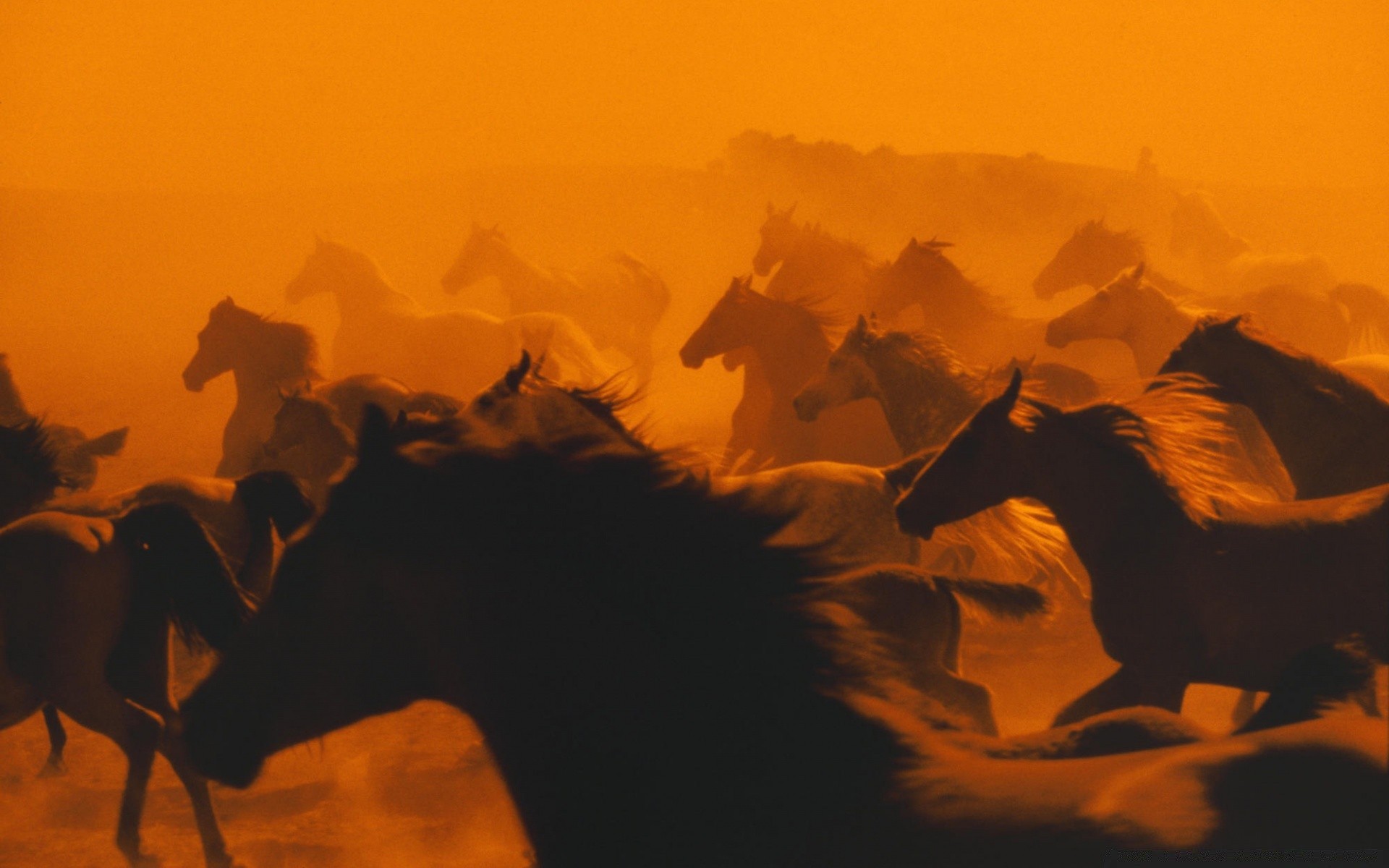 Troupeau de chevaux adultes se précipitant au coucher du soleil