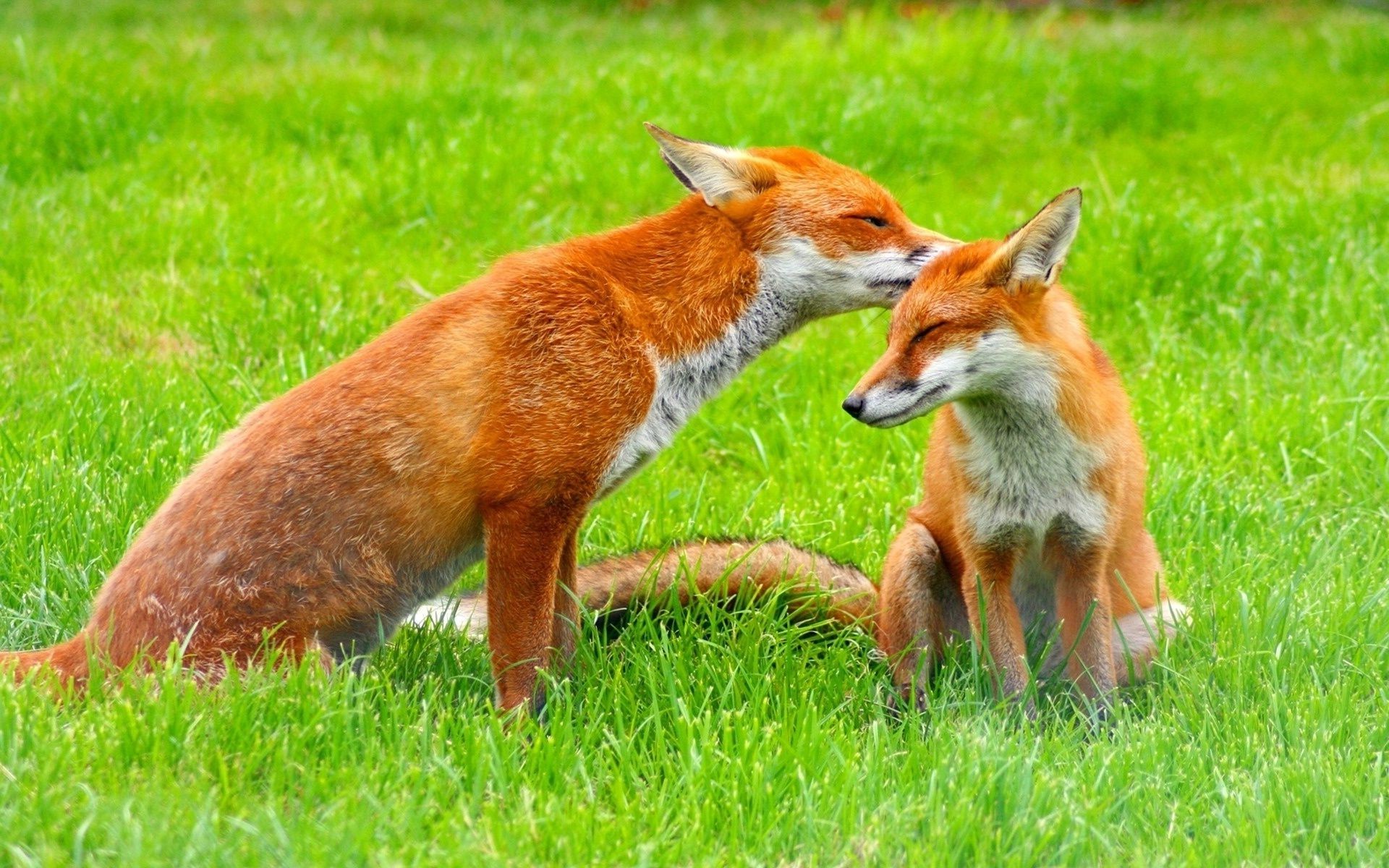 Deux renards sur l'herbe verte