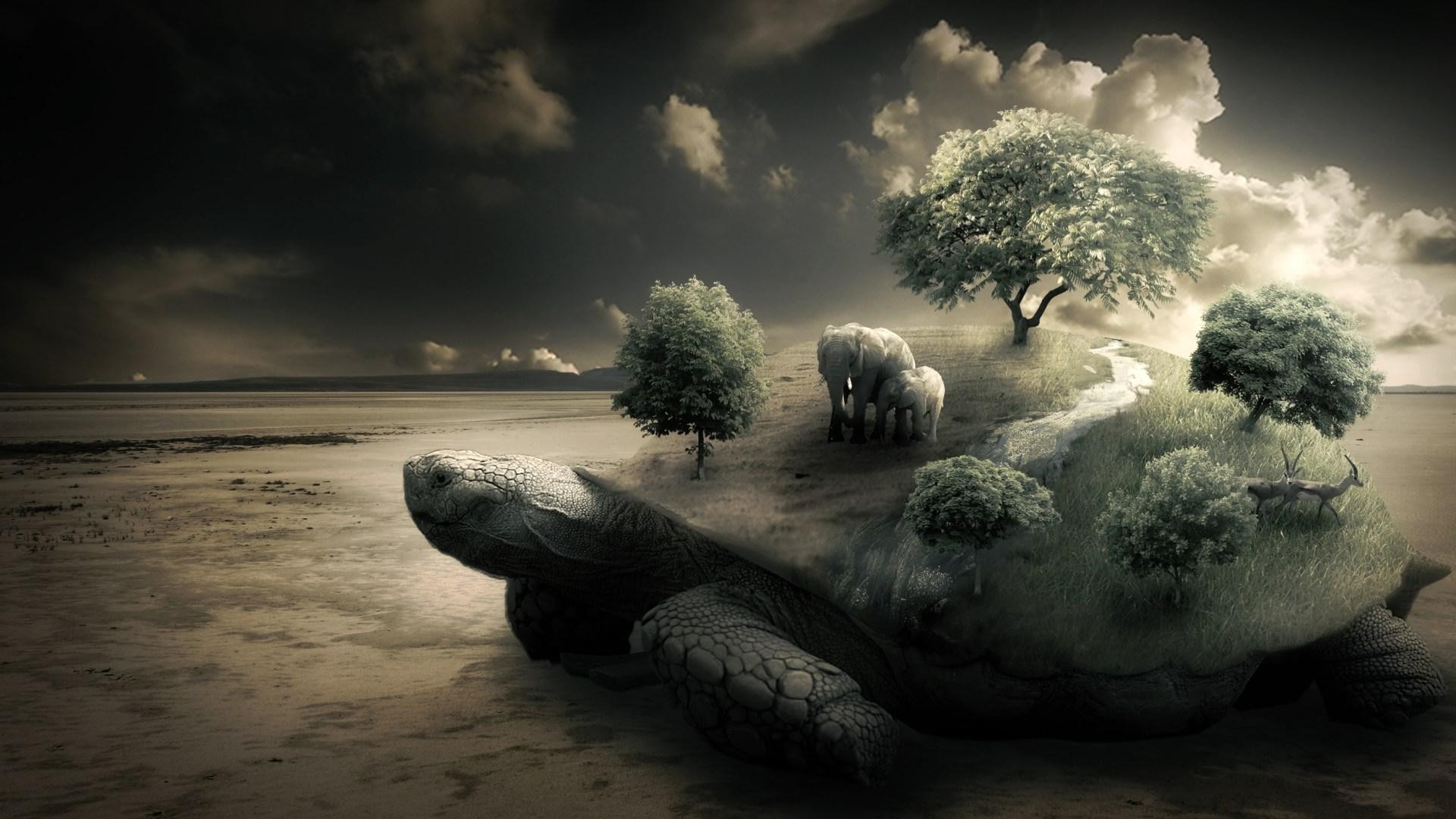 Tortue tenant sur le dos des arbres et des animaux