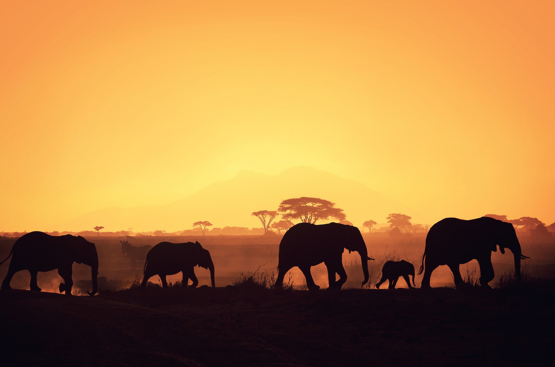 Photo de printemps d'éléphants mammifères au coucher du soleil