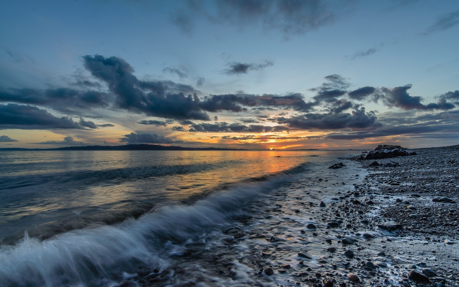 Paysage de montagnes, océan, pierres et coucher de soleil de feu
