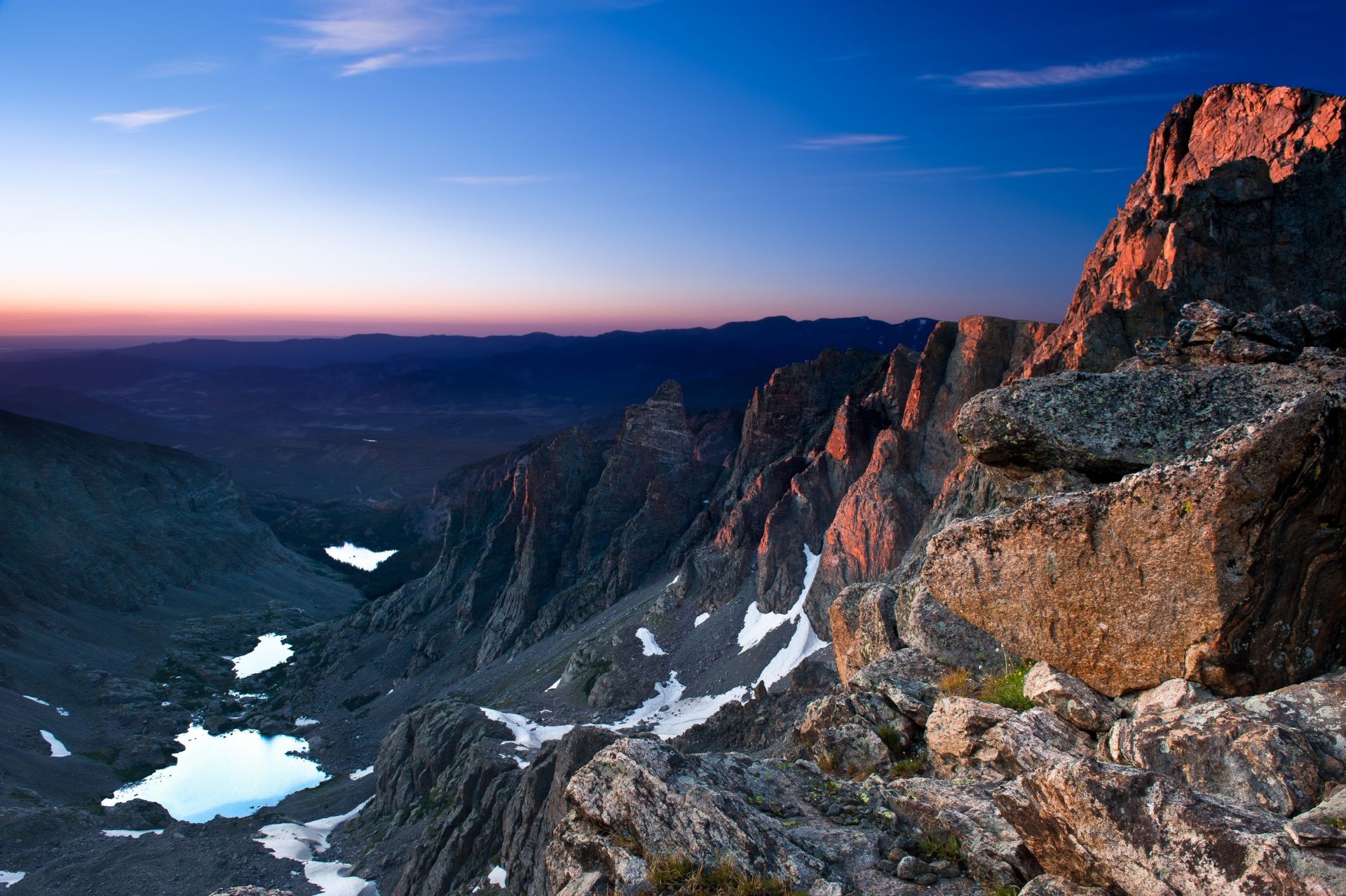 Homme assis sur un rocher. Paysage de montagne. Mer