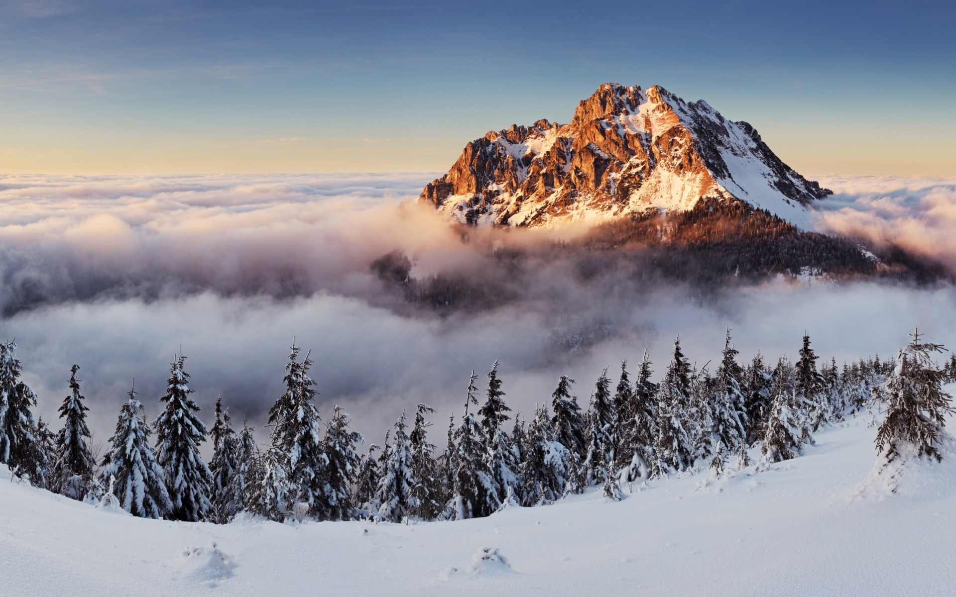 Arbres de Noël dans une rangée. Il y a du brouillard. Montagnarde