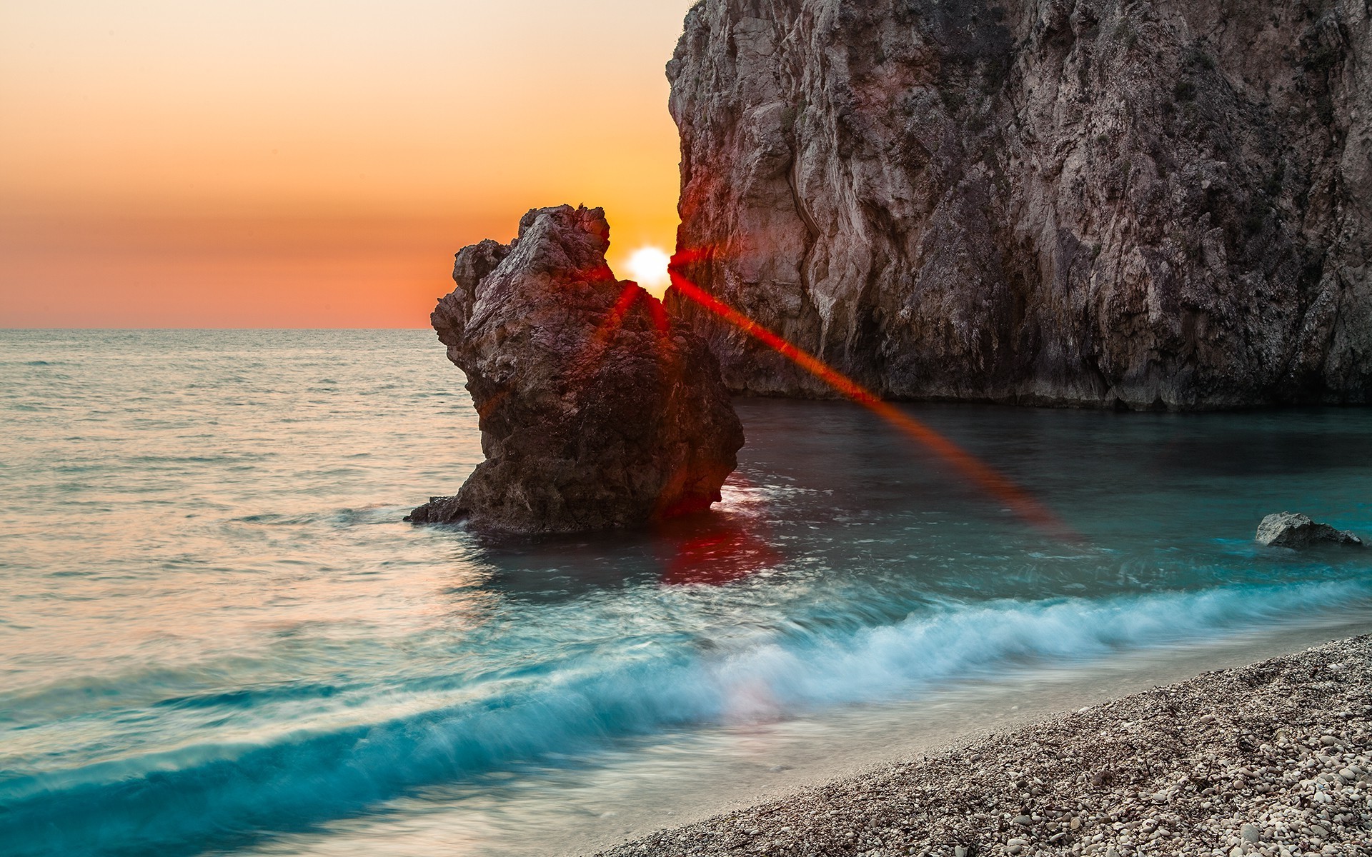 Cascade sur fond de montagnes, arc-en-ciel et arbres verts