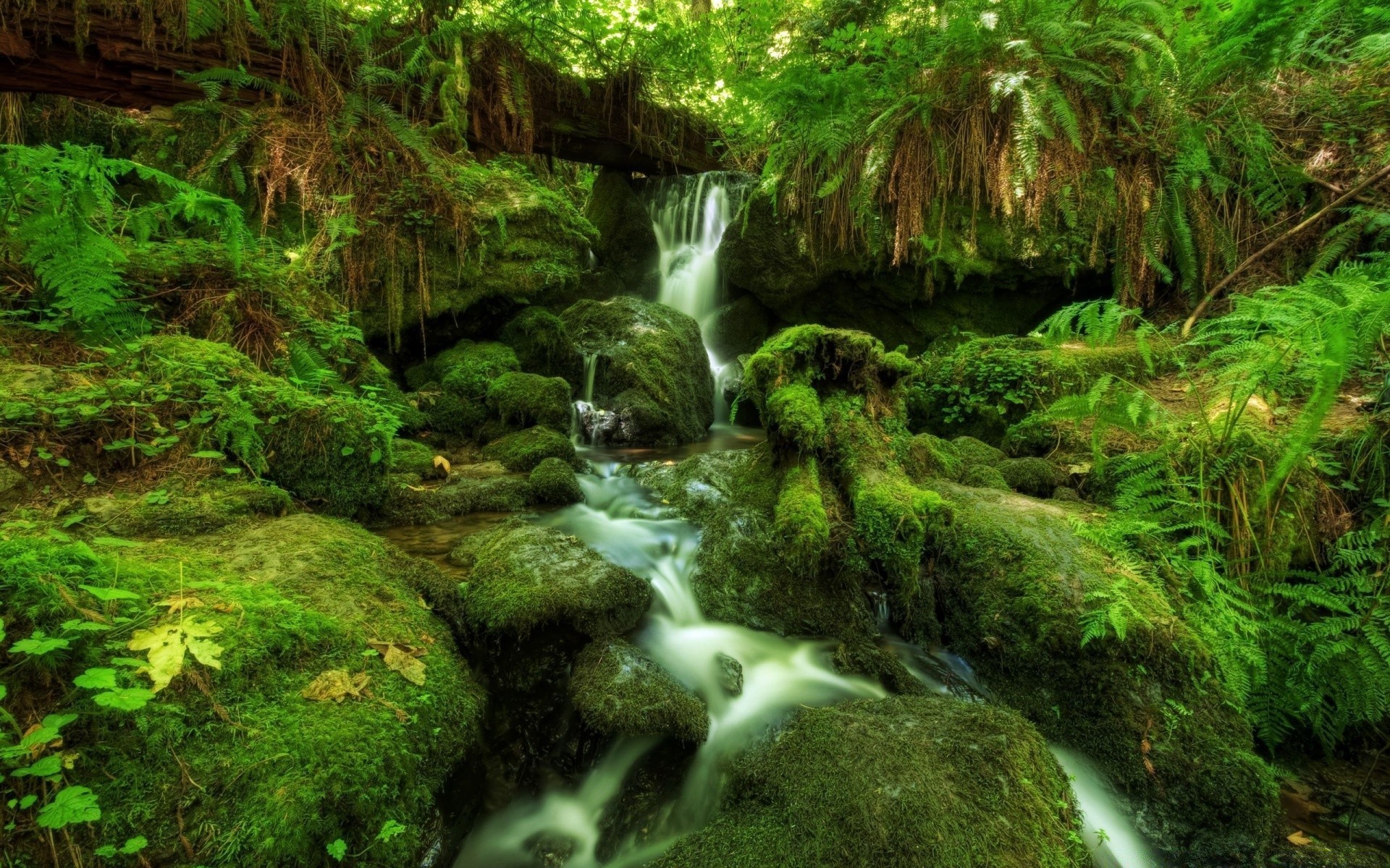 Chute d'eau dans la forêt tropicale et les pierres couvertes de mousse