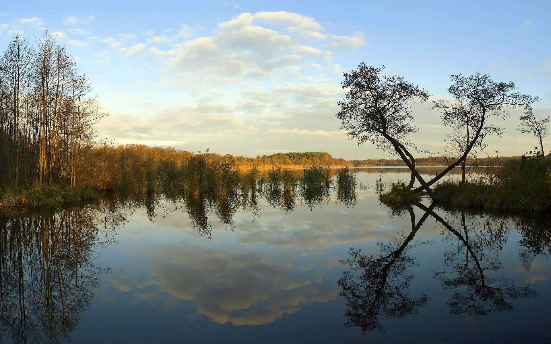 Reflet miroir de la forêt d'automne dans la rivière avec des ondulations légères