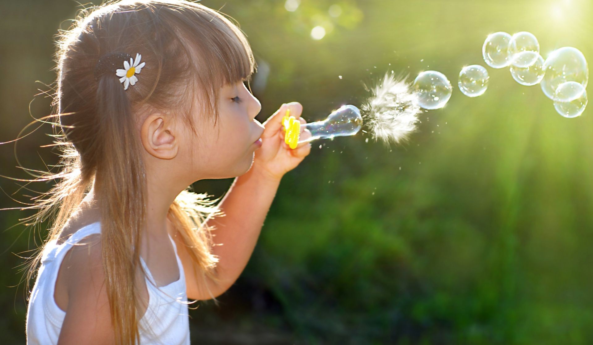 Fille avec de la camomille dans les cheveux laisse des bulles de savon