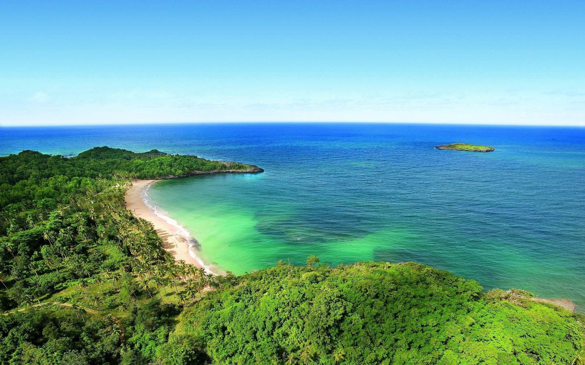 Île couverte de verdure, au milieu de la mer