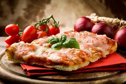 Morceau de pizza au poulet et aux champignons sur une plaque blanche à rayures noiresMorceau de pizza au poulet et aux champignons sur une plaque blanche à rayures noires