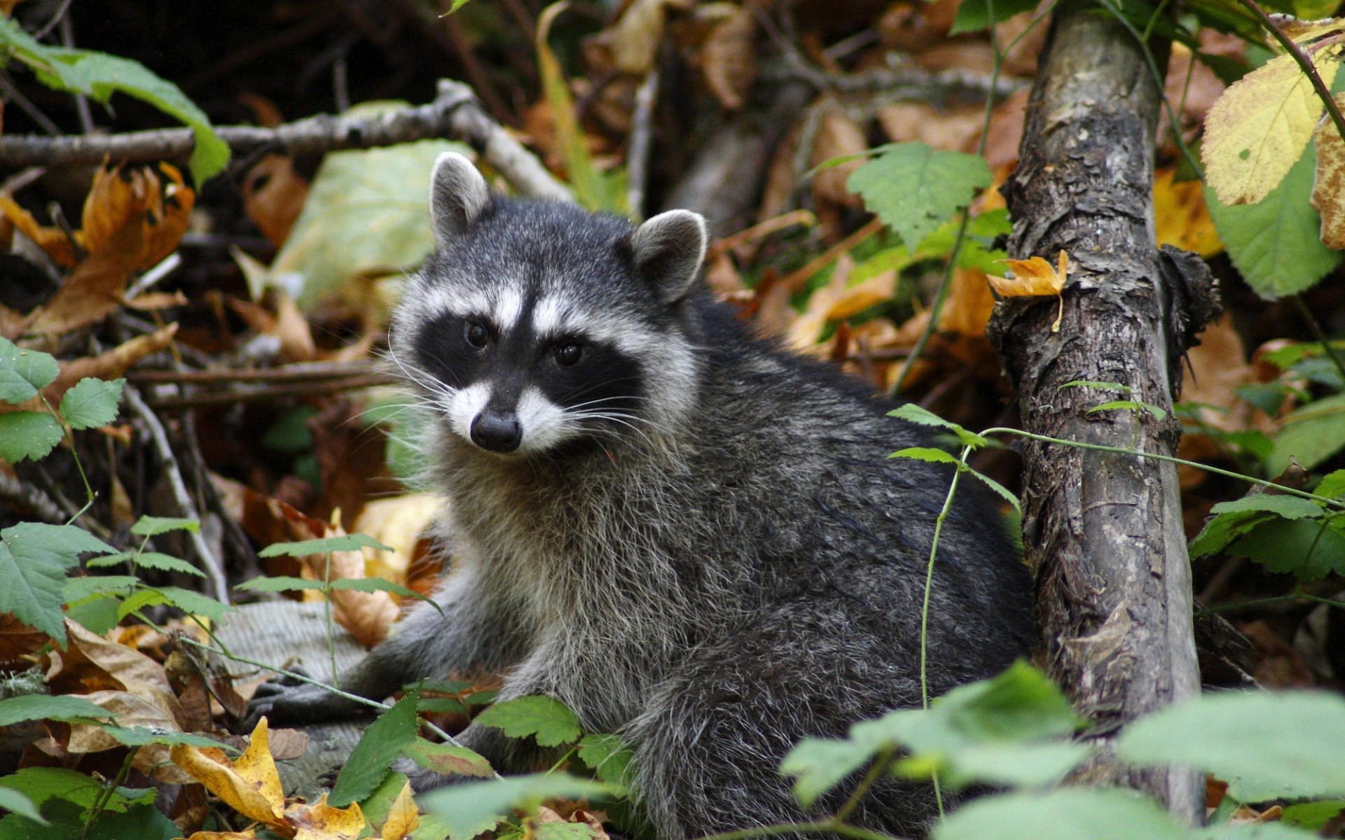 Un Raton laveur sauvage fouille dans le feuillage d'automne