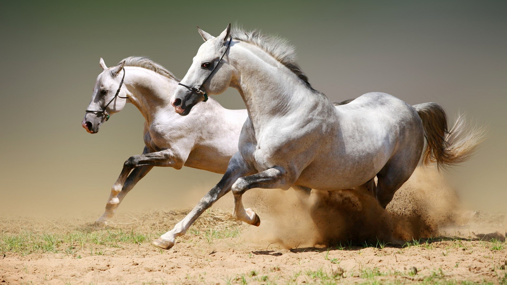 Un cheval blanc avec une queue noire et une crinière saute joyeusement sur le terrain