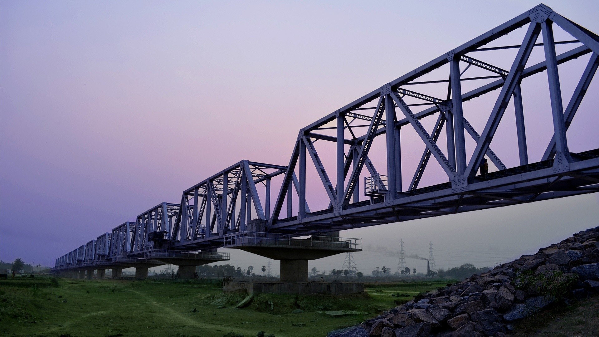 Pont suspendu au-dessus de l'eau au coucher du soleil