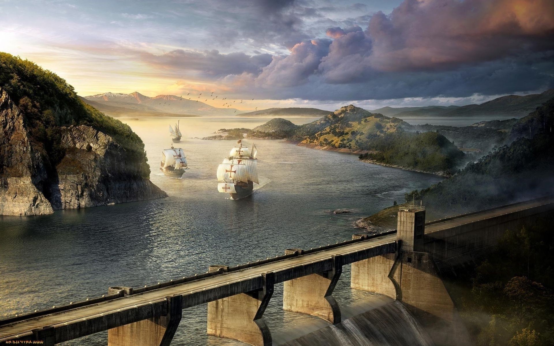 Sur fond orange nuages blancs, pont noir, montagnes et vagues