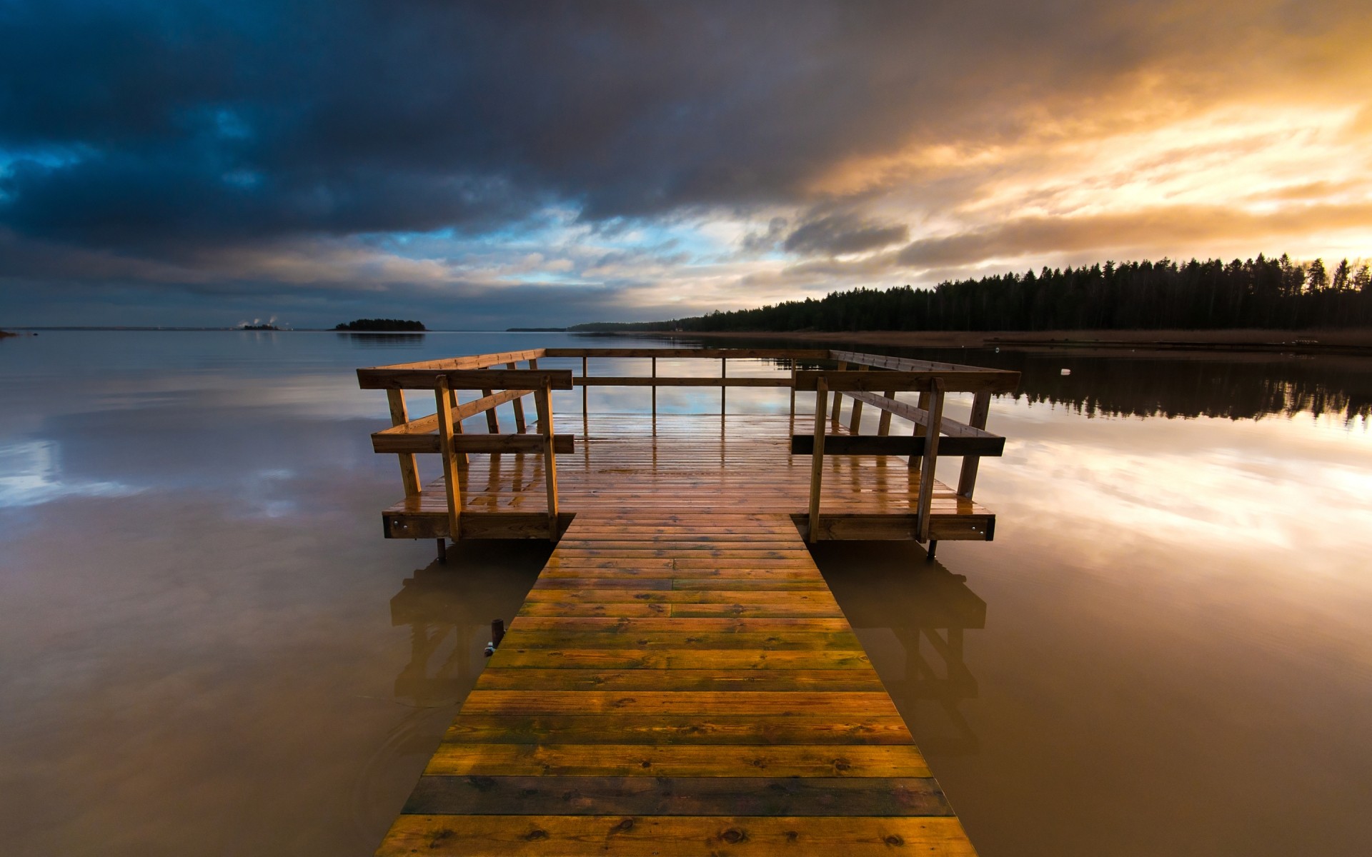 Paysage d'un long pont au coucher du soleil sur la surface de l'eau