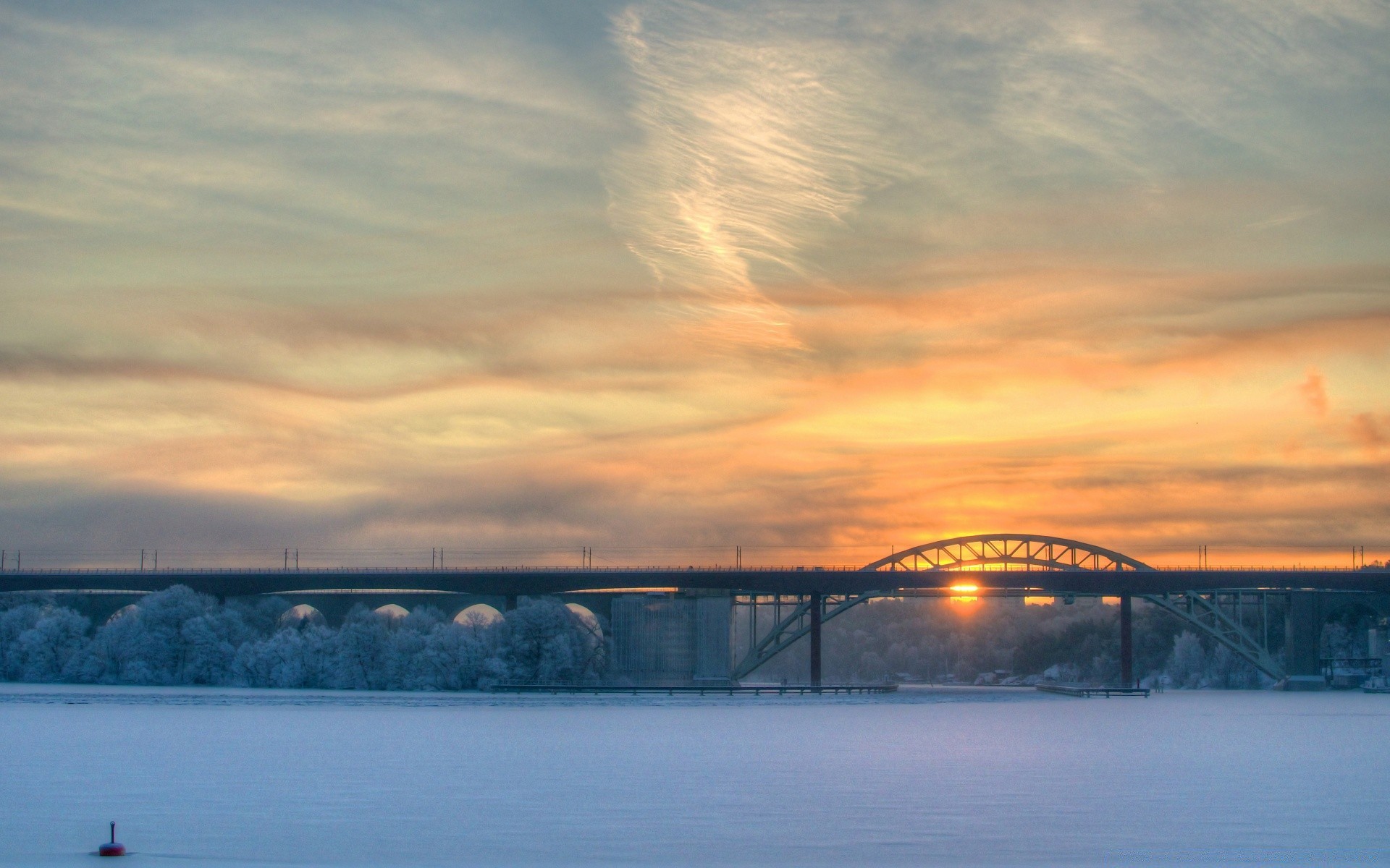 Poste ferroviaire sur fond de coucher de soleil. Paysage hivernal