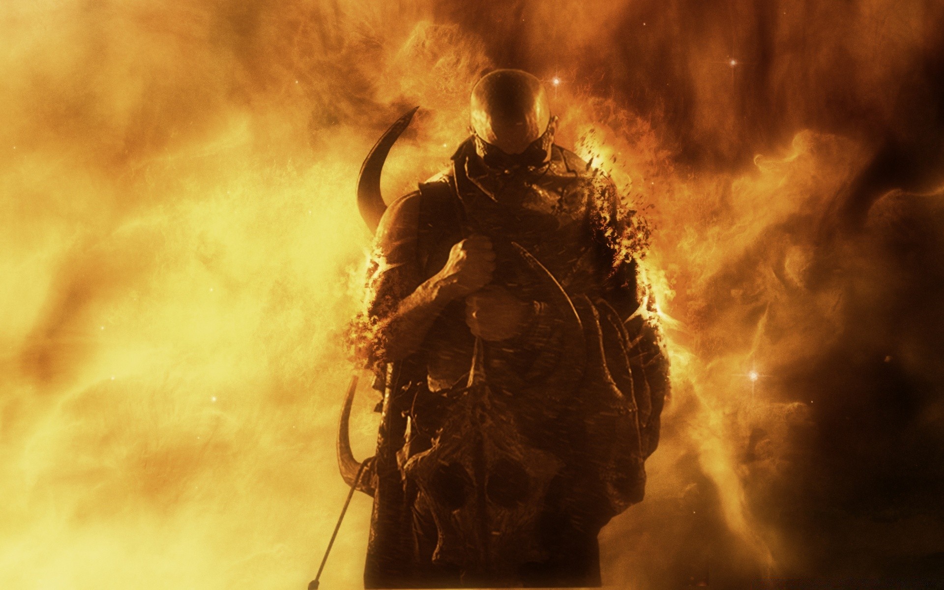 Une cascade fantastique et un homme avec une machine volante avec le logo Oblivion