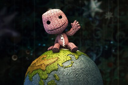 Homme tricoté assis sur un dessin animé Globe