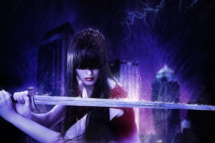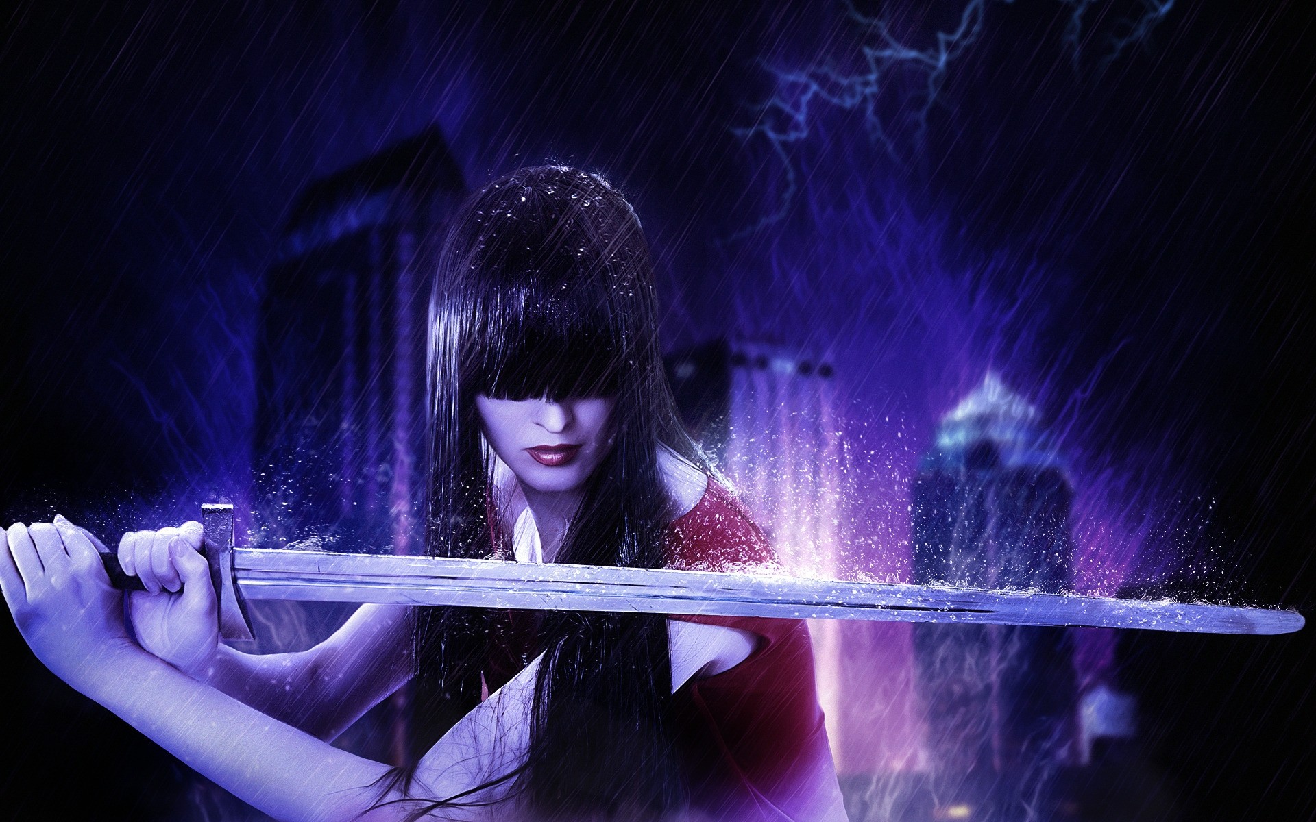 Fille étonnante qui tient une épée sur un beau fondFille étonnante qui tient une épée sur un beau fond