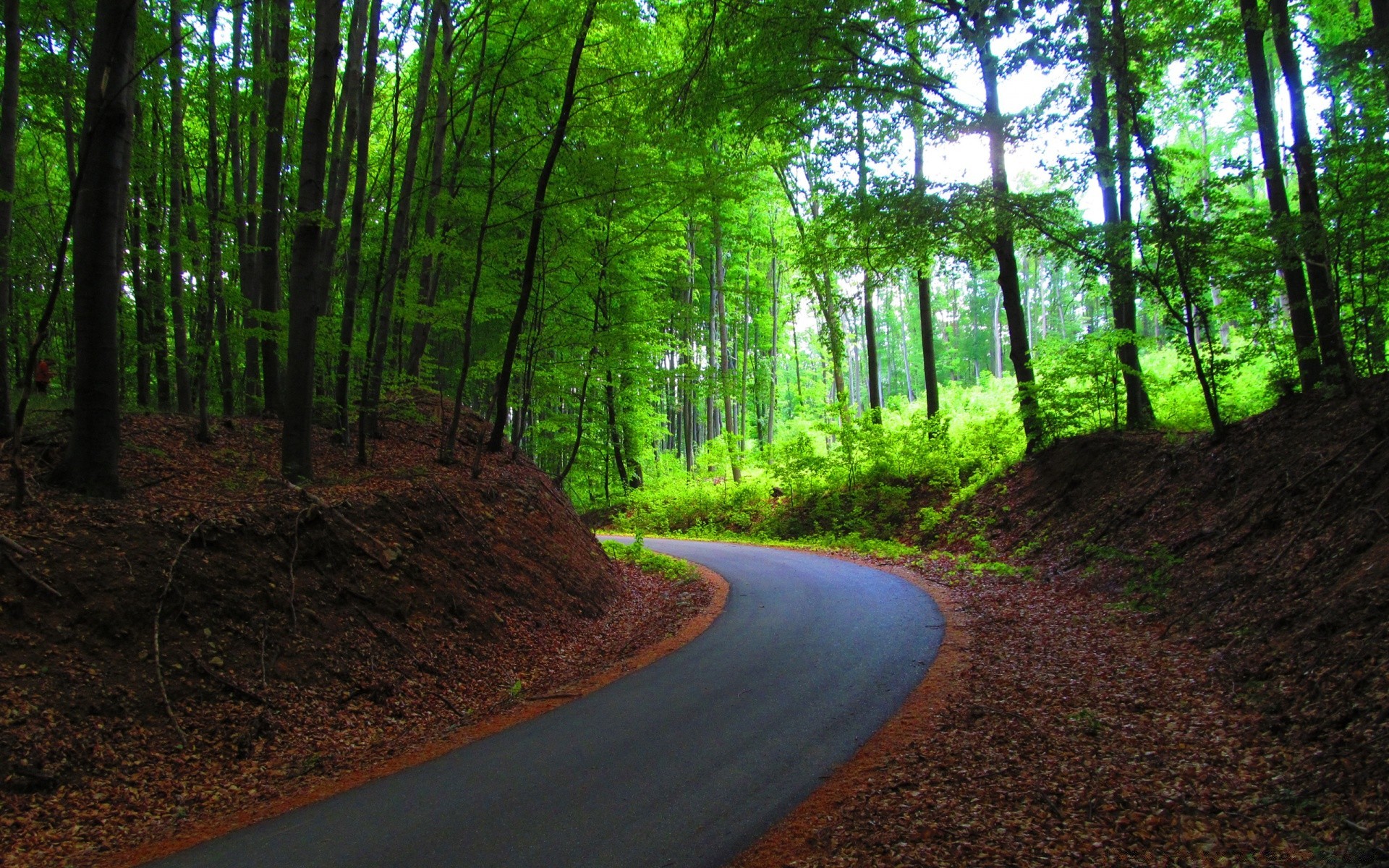 Route dans la forêt où beaucoup de verdure