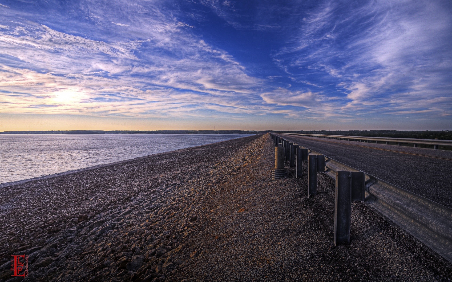 Route qui longe une plage rocheuse sur fond de coucher de soleil