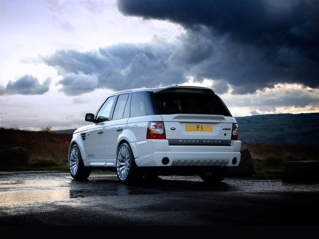 Range rover sur asphalte mouillé sur fond de nuages