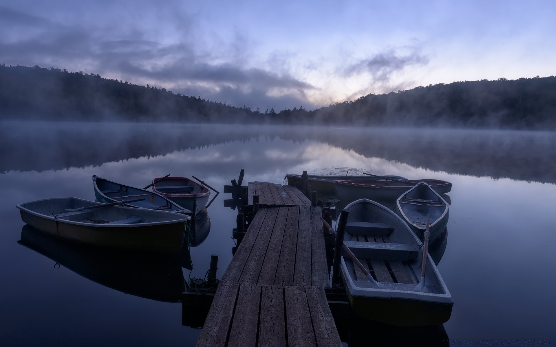 Bateaux en bois dans la pénombre sur l'eau