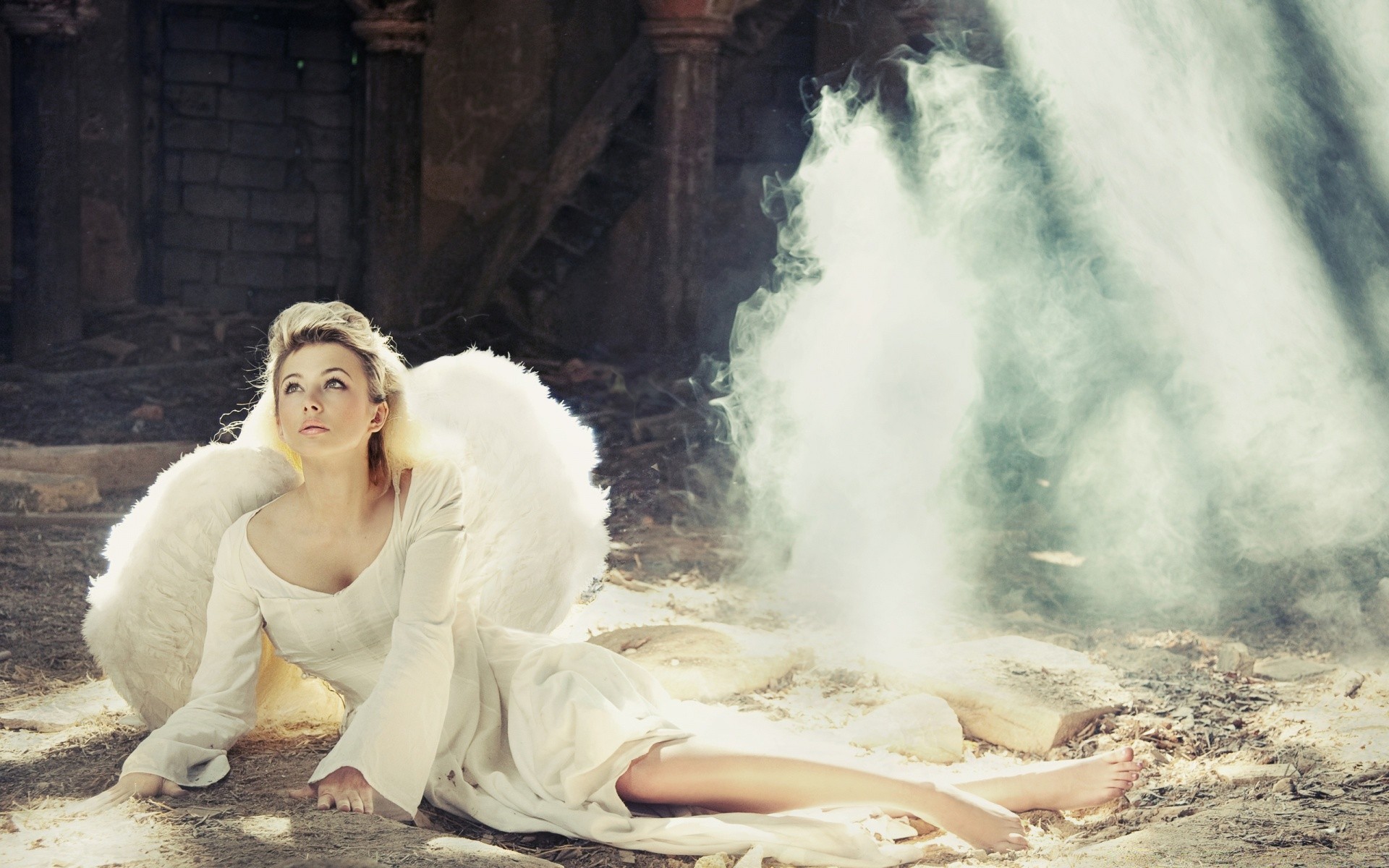Fille avec une robe blanche avec des ailes blanches sur le sol