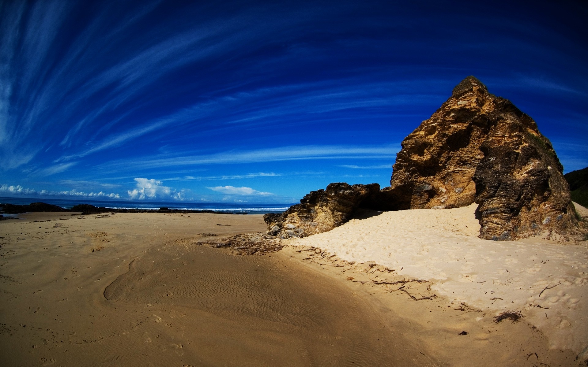 Plage de sable avec un rocher sur l'océan