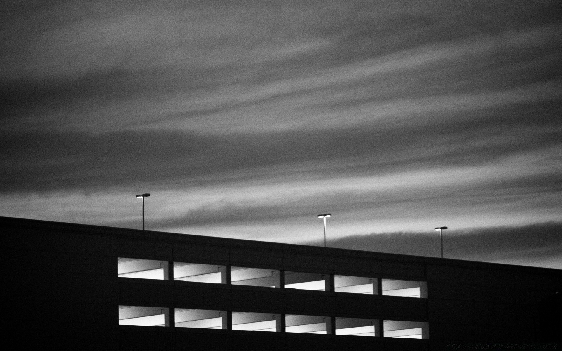 Photo noir et blanc d'un pont coucher de soleil avec des lanternes