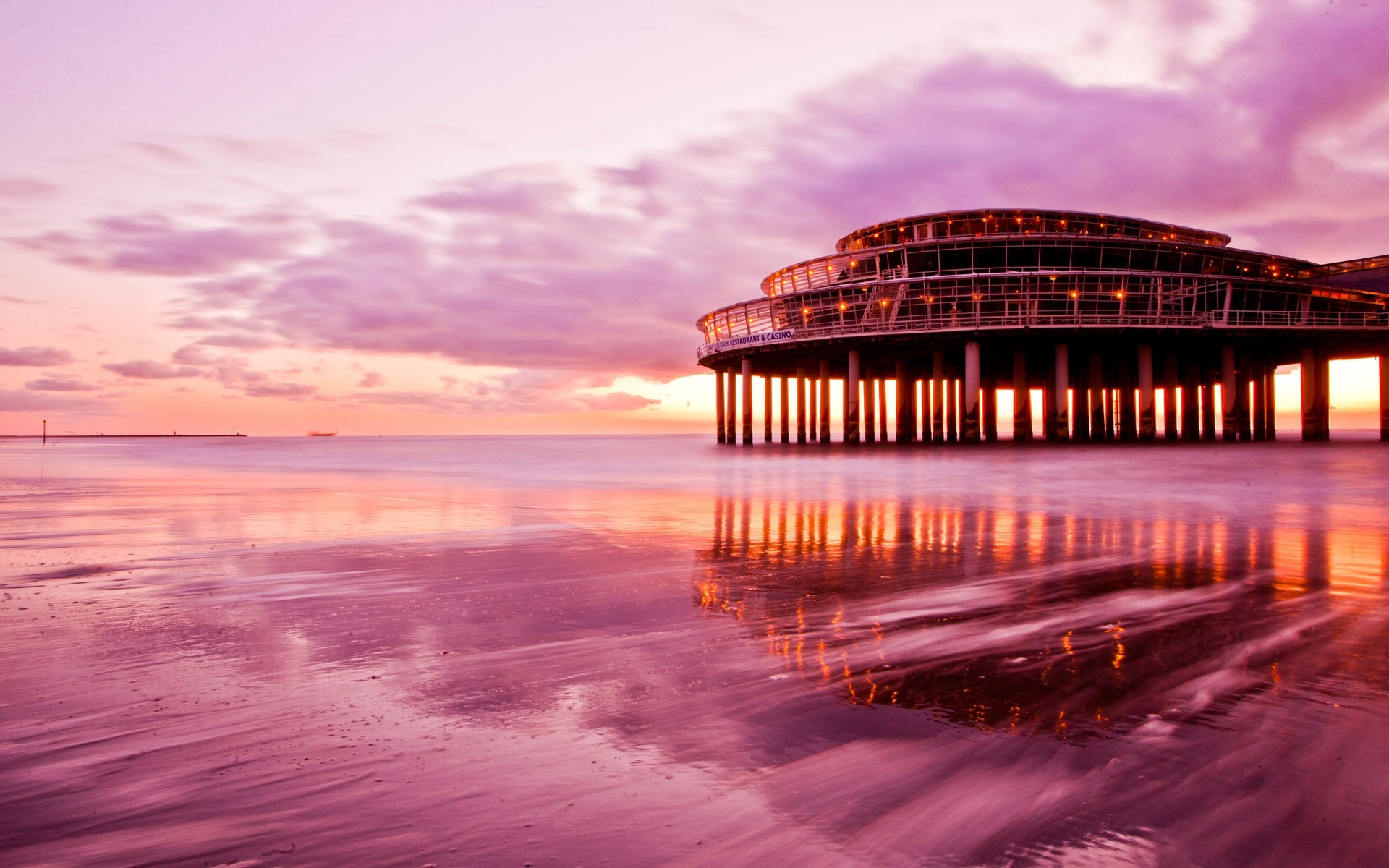 Plage rose au coucher du soleil sur le fond du bâtiment