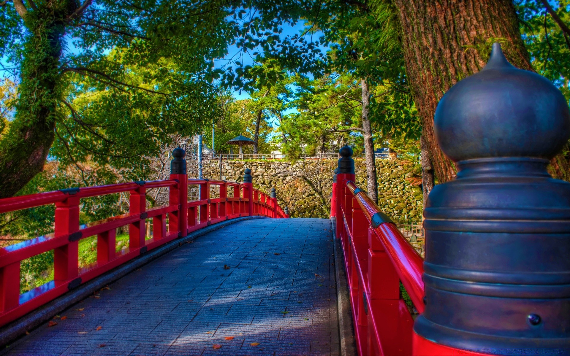 Pont rouge avec des pavés de pierre dans le parc
