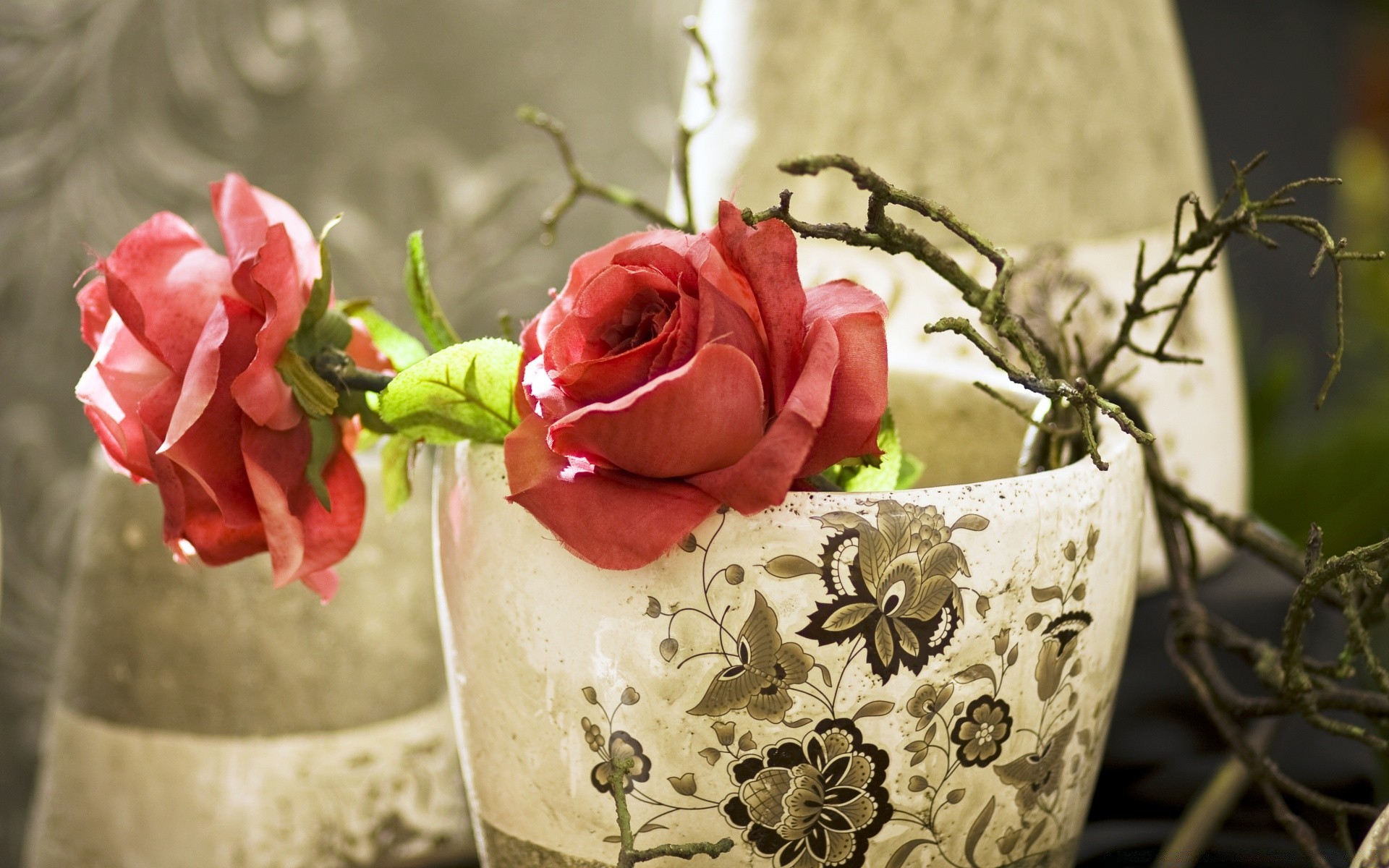 Deux roses avec des racines en saillie dans un pot blanc avec des motifs