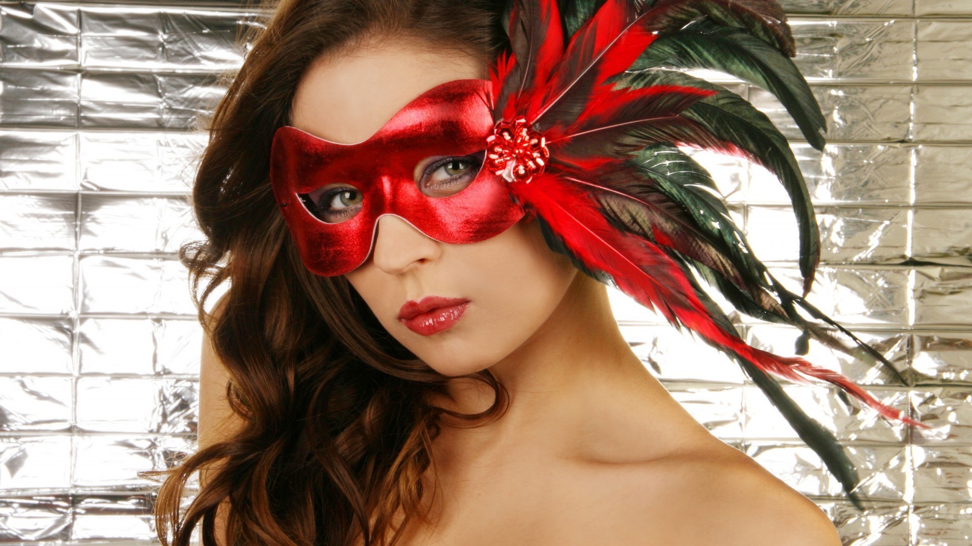 Brunette dans un masque rouge avec des plumes