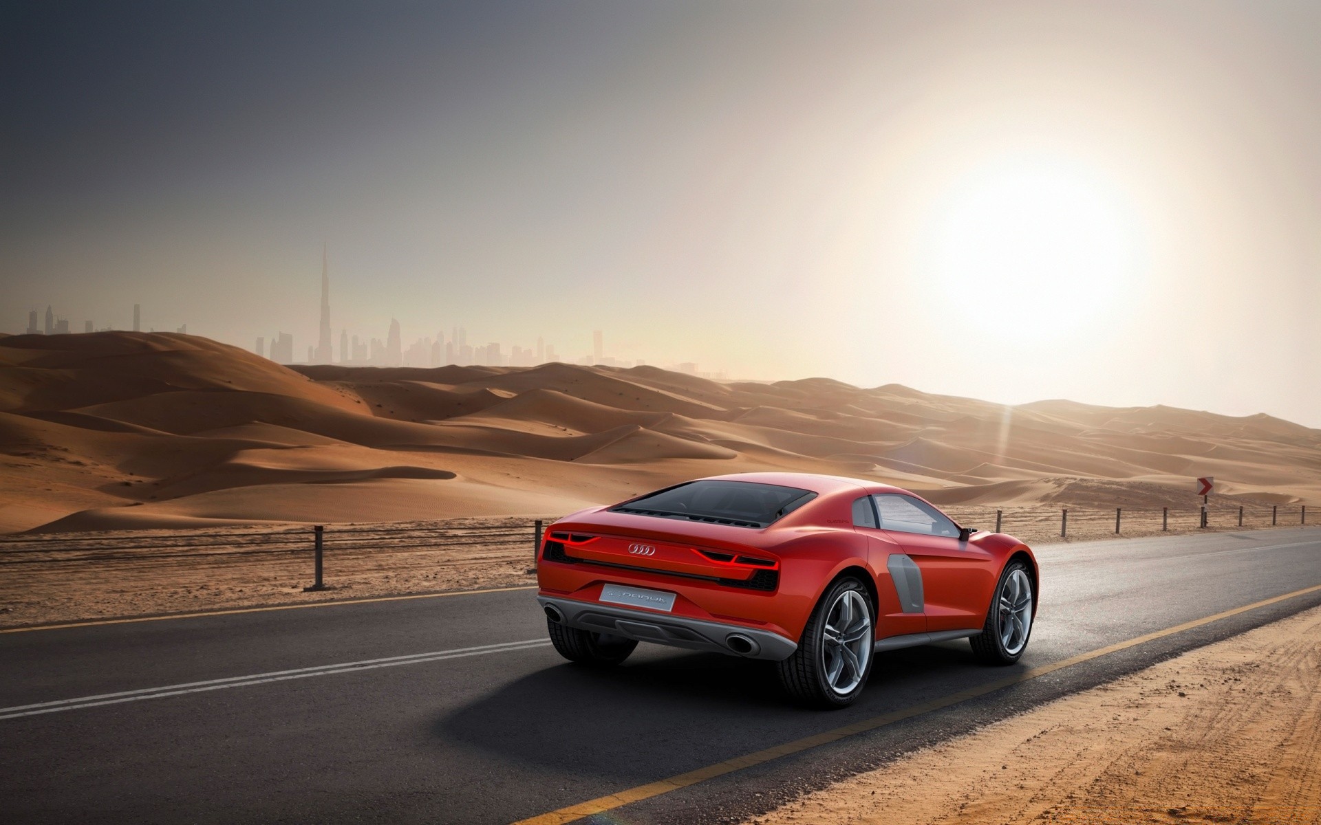 Voiture rouge près d'un manoir dans la ville au pied de la montagne
