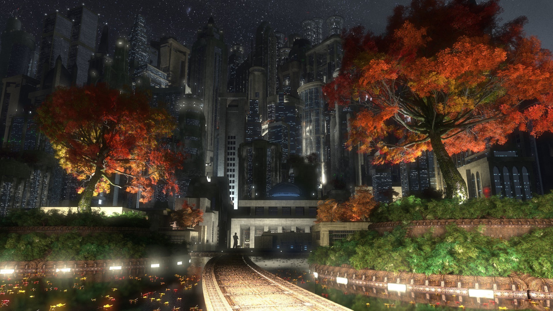 Parc d'automne éclairé sur fond de gratte-ciel