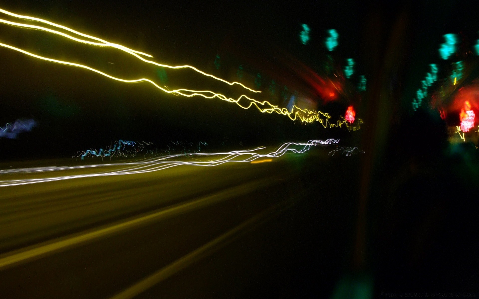 Lumières floues de la ville de nuit: lampadaires, phares des voitures, enseignes au néon des magasins