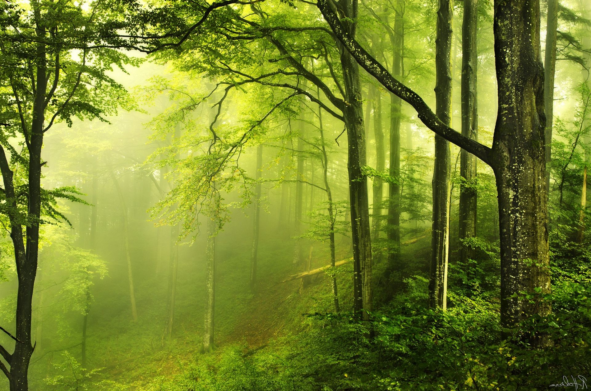 Le soleil se fraye un chemin à travers le brouillard dans la forêt