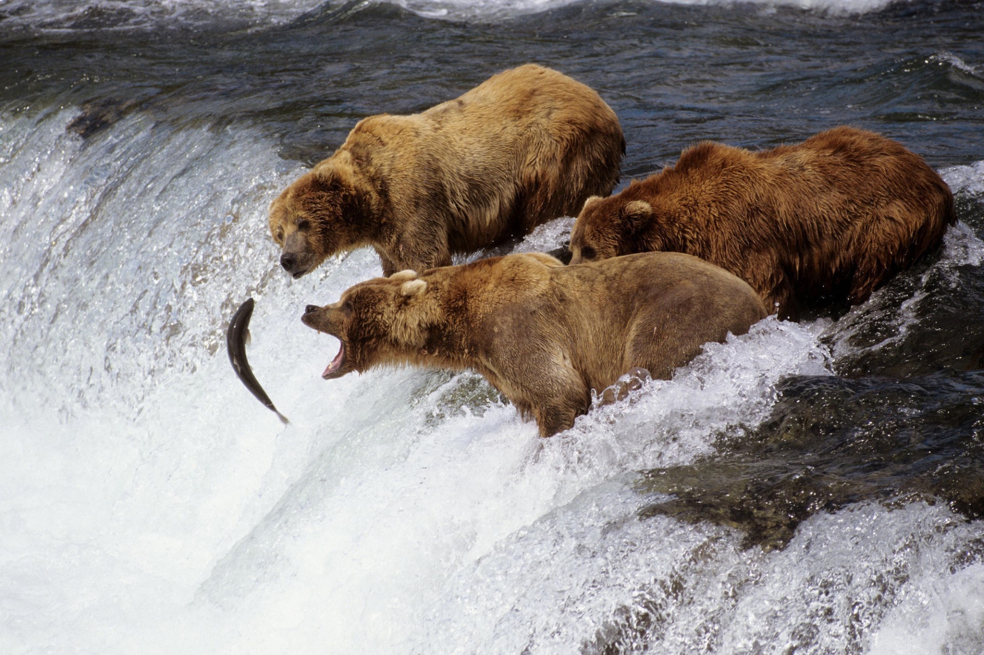 Grizzlis attrapant le saumon debout au sommet d'une cascade