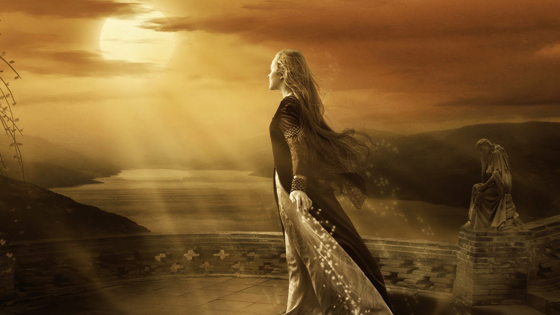 Dans la lumière du coucher du soleil se dresse comme une statue d'une belle femme