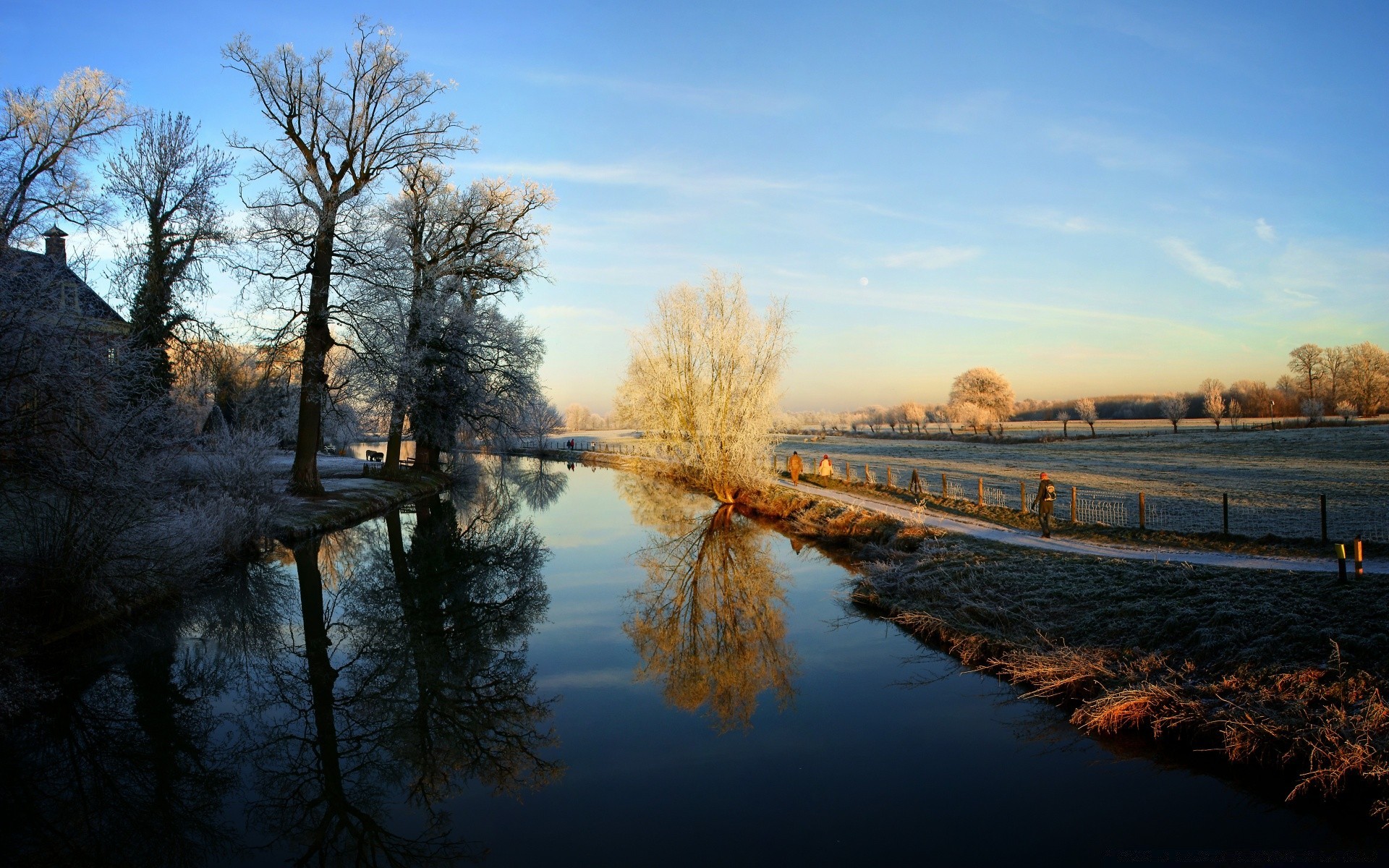 Arbres à l ombre et au soleil se reflétant dans la rivière