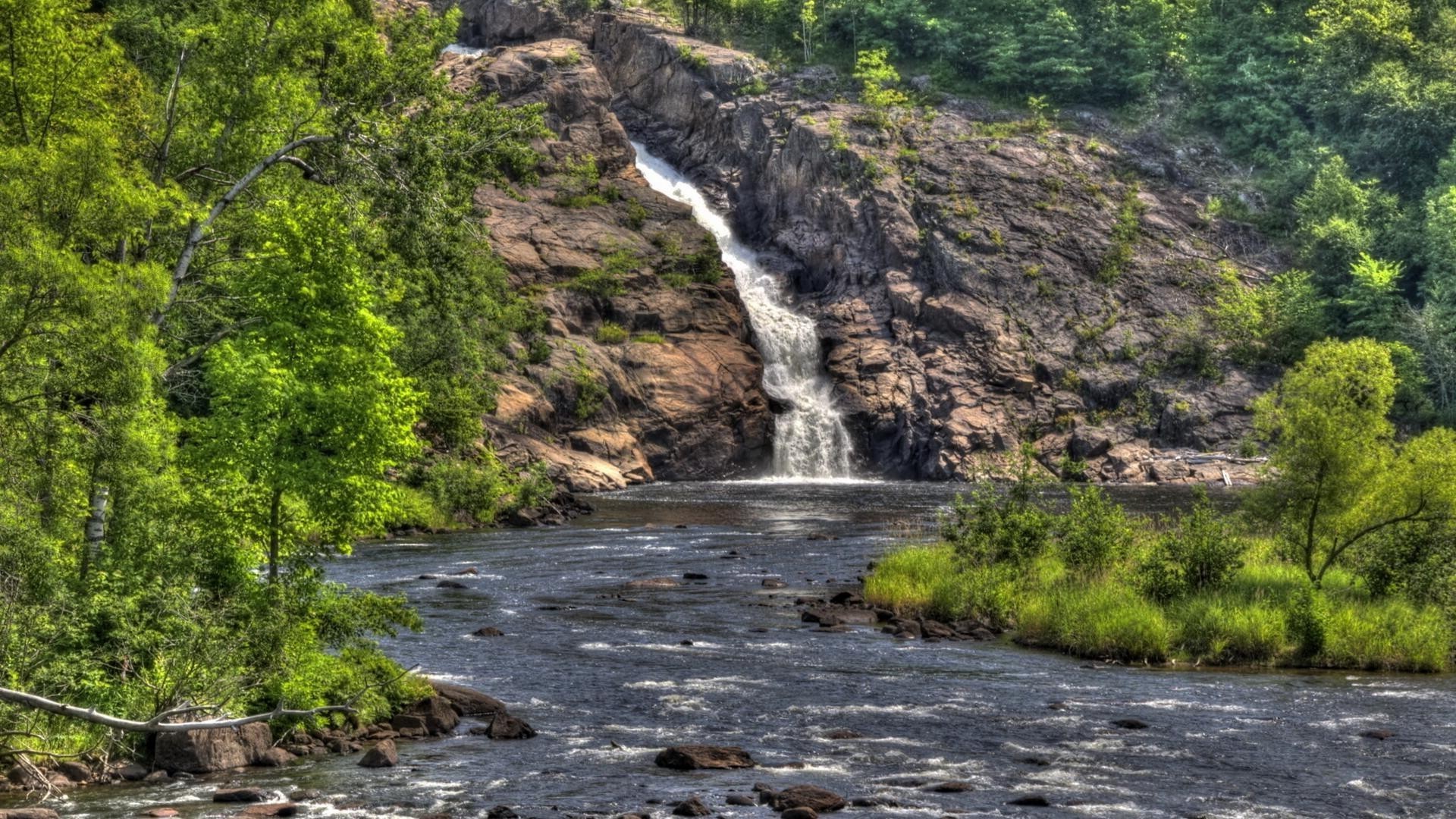 Cascade se jette dans une rivière de montagne au milieu de la forêt