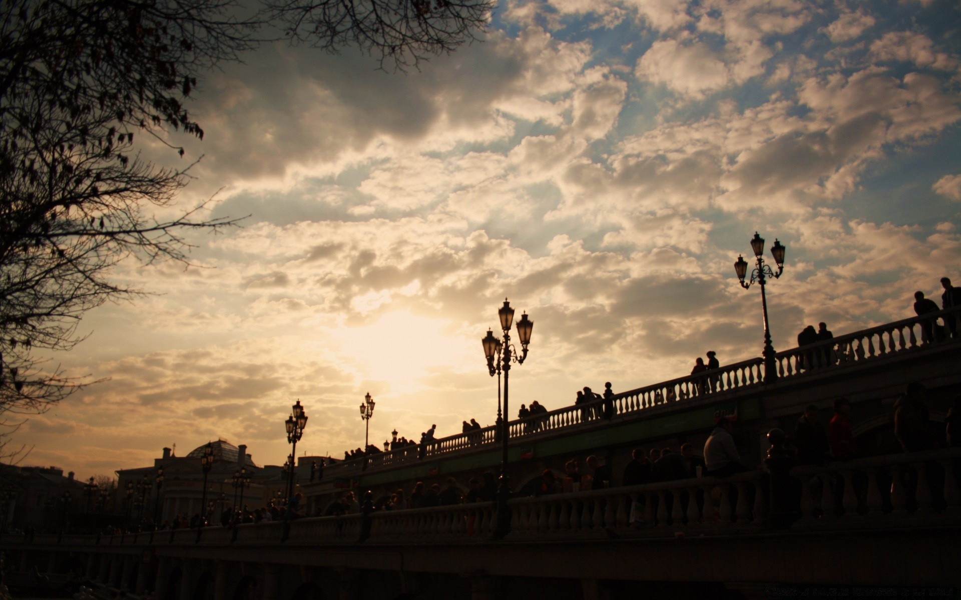 Soirée coucher de soleil beau ciel lanternes gens se promènent