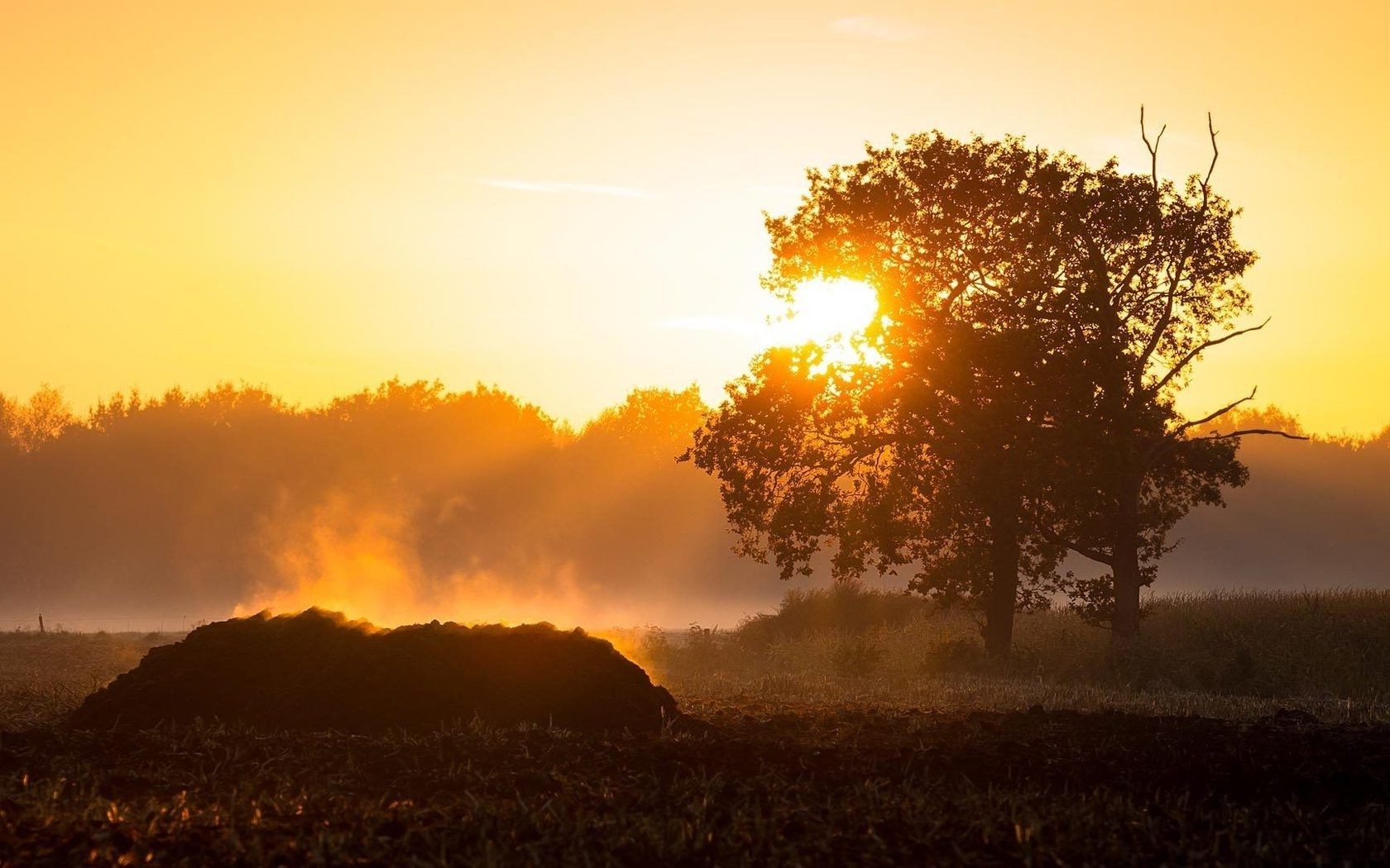 Coucher de soleil sur fond de champ et de bois