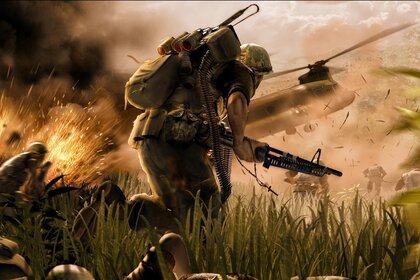 Un soldat avec un fusil d'assaut dans un casque se trouveUn soldat avec un fusil d'assaut dans un casque se trouve