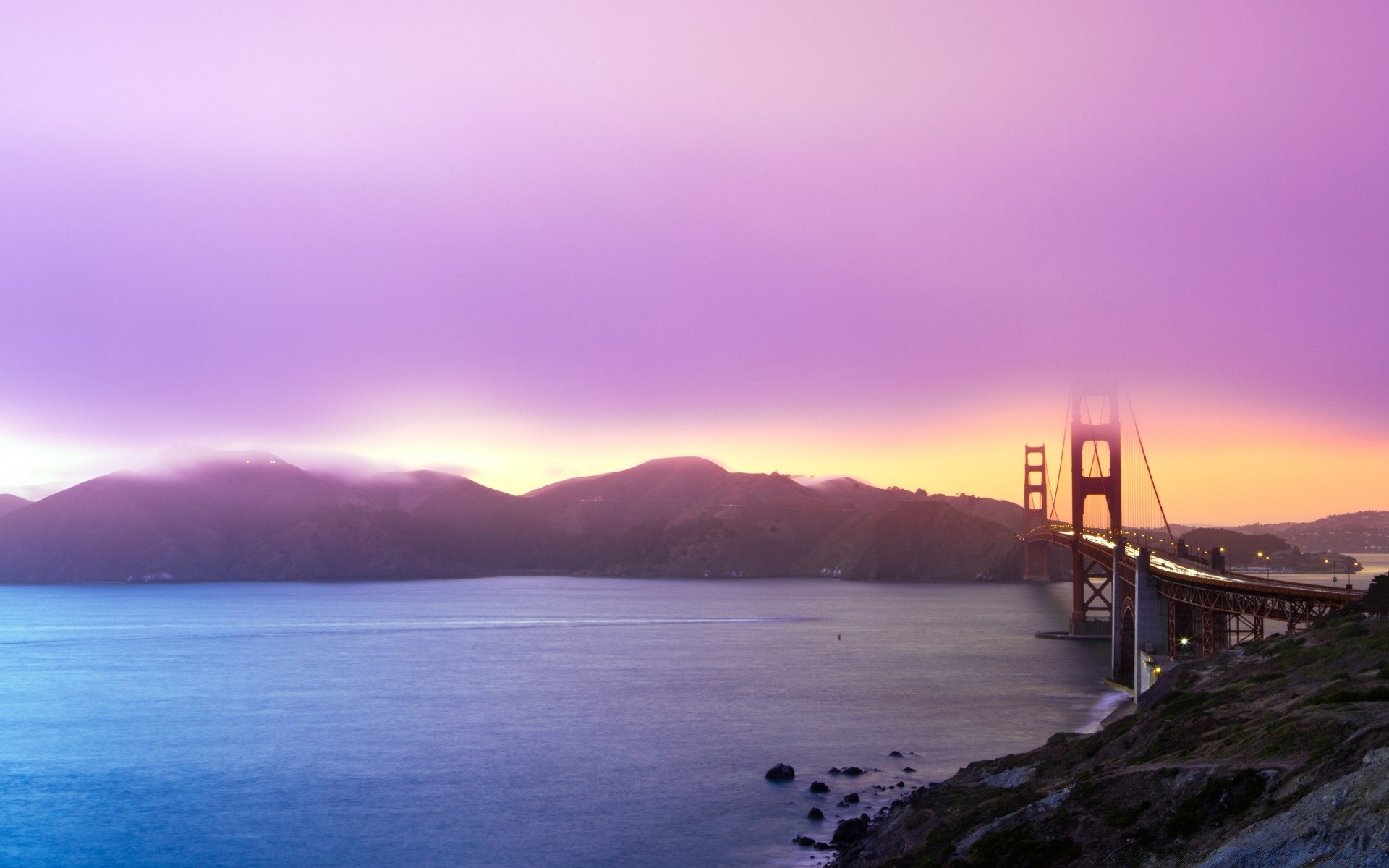 Beau coucher de soleil avec vue sur l'eau et le pont