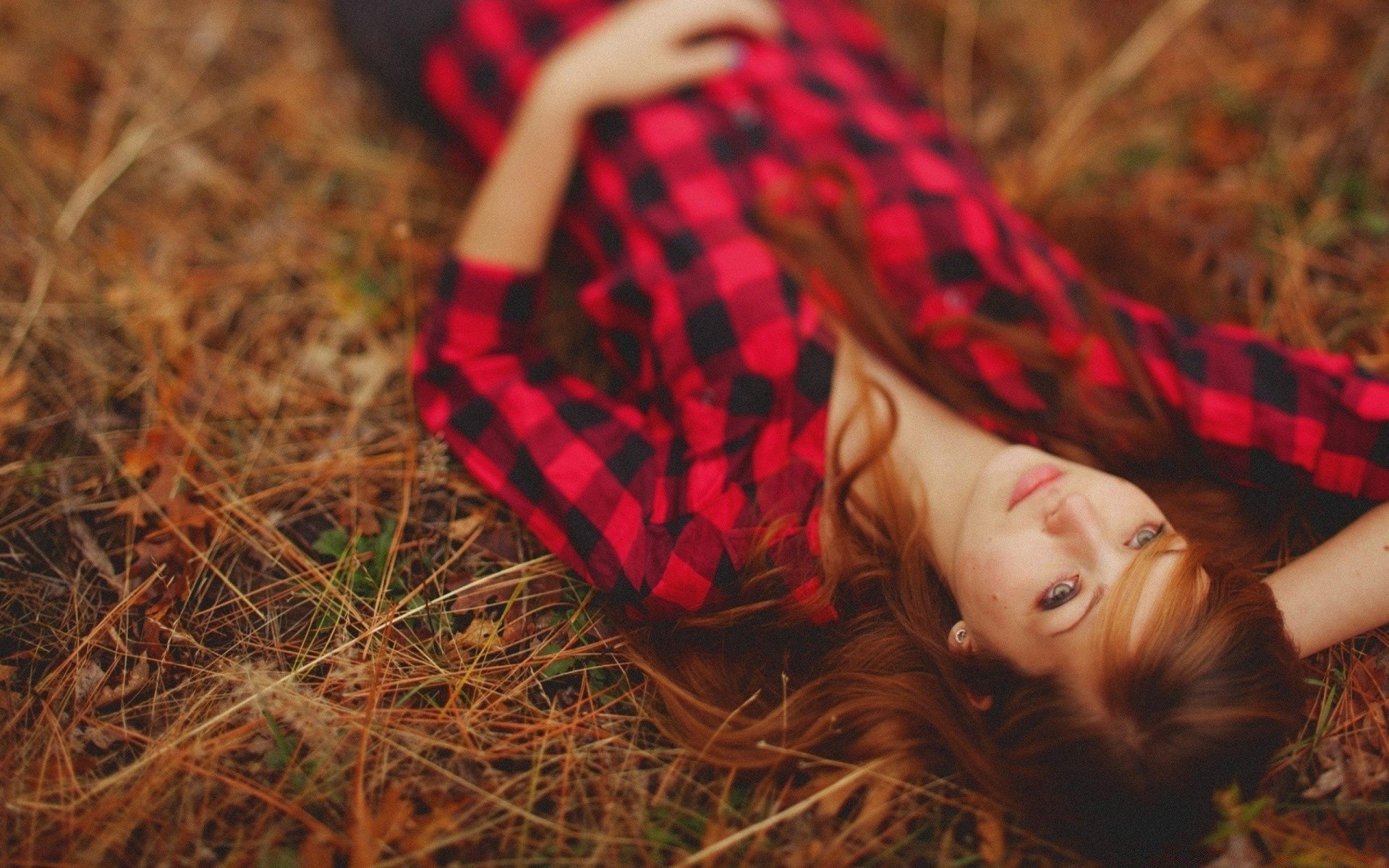 Une fille dans une chemise à Carreaux se trouve sur l'herbe sèche